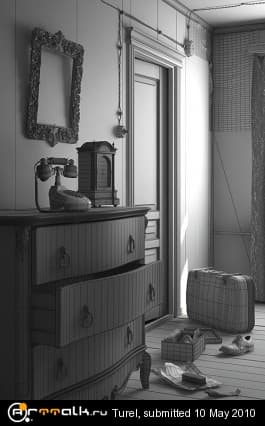 Все началось с просмотра фильма "Мэри Раили", где мне очень понравился мимолетный кадр со старинными часами. Сделав скриншот (http://i030.radikal.ru/1005/b1/9ccaebb20fef.jpg), я постарался воссоздать их в 3d. Но постепенно идея и композиция развивались и я не мог удержаться, чтобы не привнести в интерьер небольшую историю.