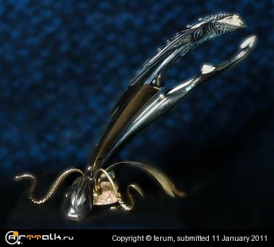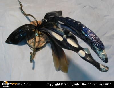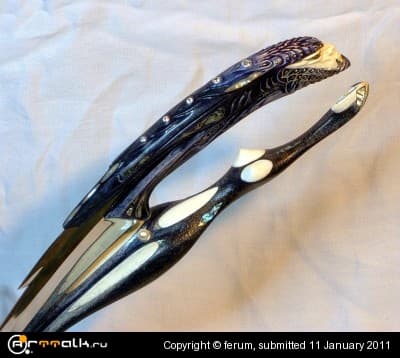 кабинетный нож, материалы: сталь, бронза, жемчуг, фианиты , серебро, рог коровий, рог лося, тонирование, инкрустация, камень